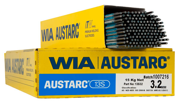 Austarc 13S is the popular “blue and white striped” general purpose electrode for smooth mitre fillet welding applications. 13S has a soft and stable arc and produces flat, uniform fillet welds with ease and a self peeling slag action.