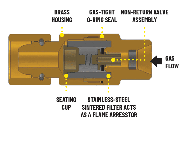 These COMET™ FBA’s are designed to prevent flashback flame and reverse flowing gases inside the regulator or torch from burning or mixing in the hose and gas supply system.