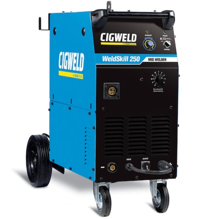 The WeldSkill 250 is a single phase compact power source designed specifically for the handy person or tradesmen that requires high quality welding performance. This constant voltage power source is rated to 250 amps @ 25% duty cycle and provides excellent arc performance with solid and flux coated welding wires. This unit is suitable for use with either CO2 or mixed gases.