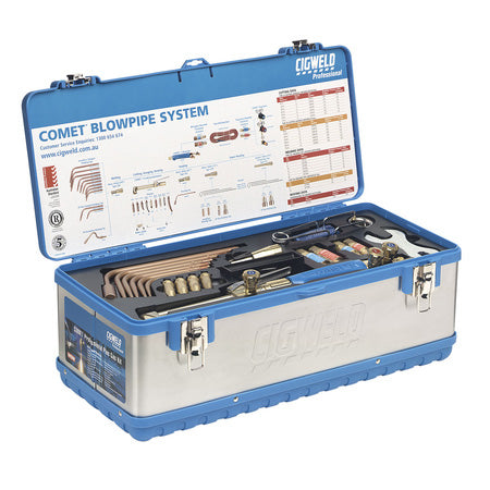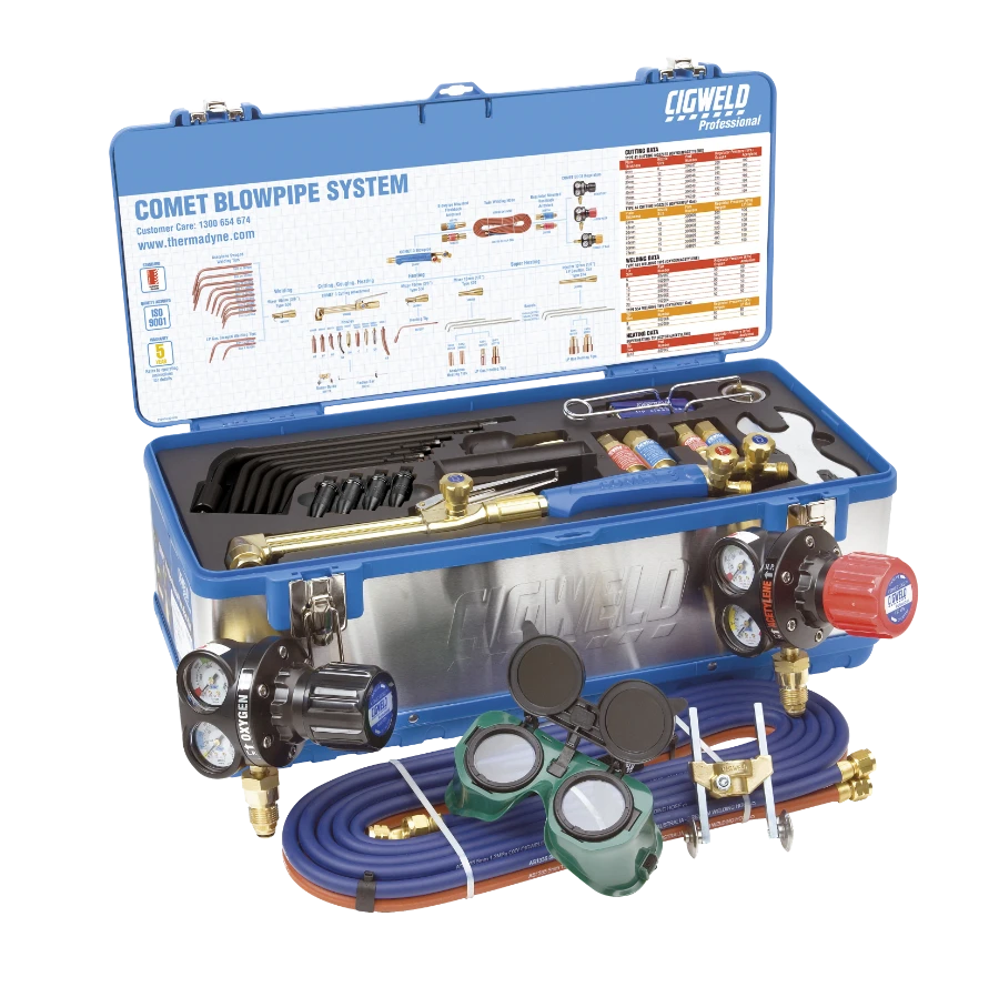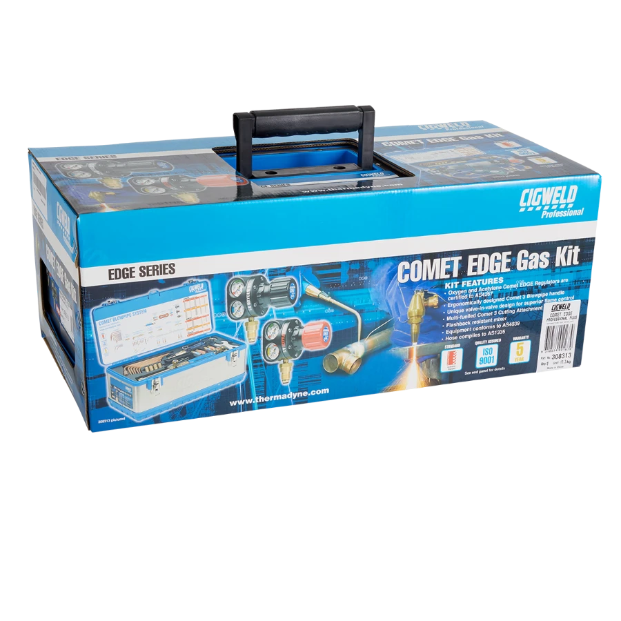 A complete outfit containing everything the professional tradesman or other discerning buyers could possibly want for gas cutting, welding and heating. The components in this outfit provide incredibly good value for money. A magnificent kit that has the Gasgaurd safety feature standard in the regulators. The components in this COMET EDGE Gas Kit conform to AS 4839
