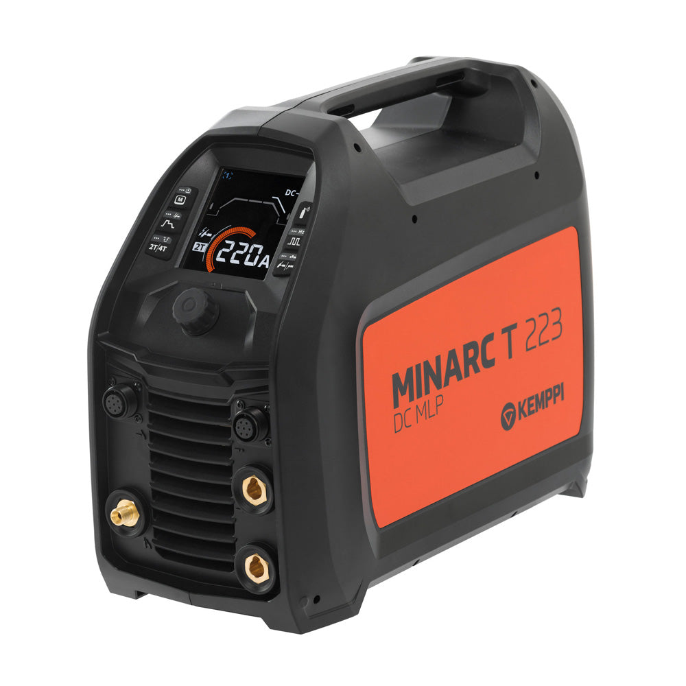 The Kemppi Minarc T 223 DC MLP Portable TIG Welder is a portable, small, yet mighty TIG welding machine designed for welders on the go. With a powerful output of 220 amps, this portable welding machine delivers precise DC TIG and MMA performance and is protected with a durable and stylish molded casing. Kemppi's professionals design, engineer, build, and test every Minarc T DC TIG welding power source in Finland, ensuring reliable Finnish welding quality for every weld.