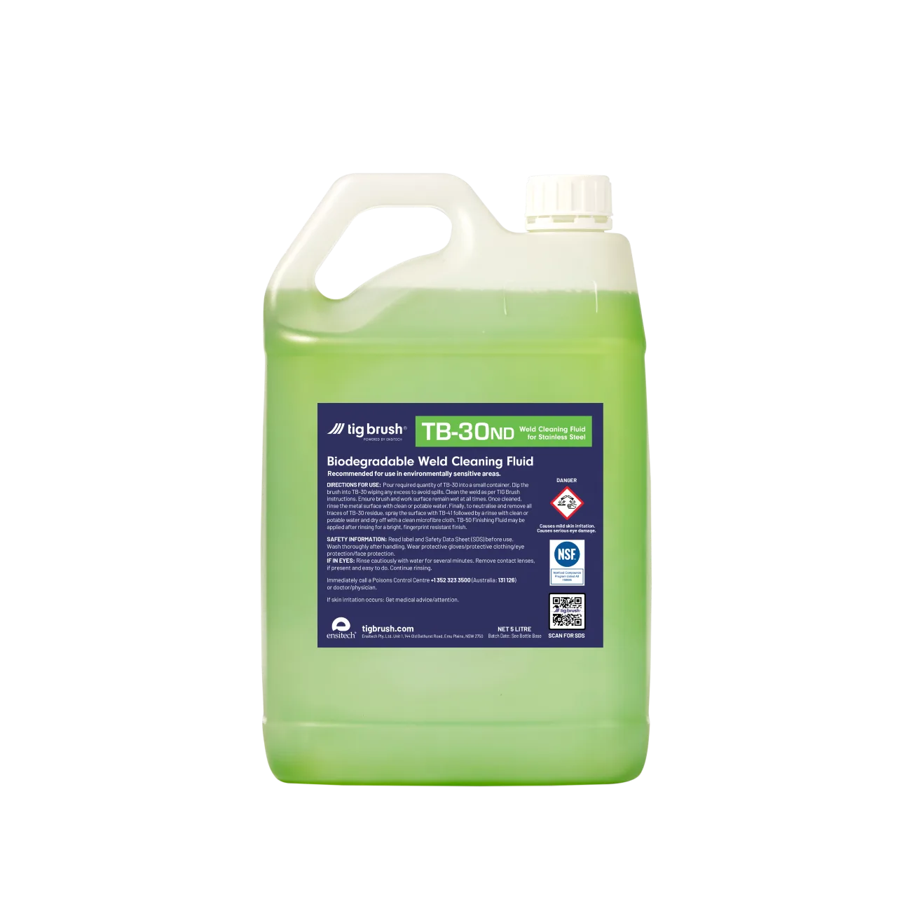 This non-dangerous, biodegradable weld-cleaning fluid is kind to the environment and is widely used in manufacturing and maintenance of equipment for food and beverage industries. It cleans as effectively as TB-25, but does not polish – an advantage if the surface appearance must not be changed during cleaning). For best results, neutralise with TB-41 after cleaning.